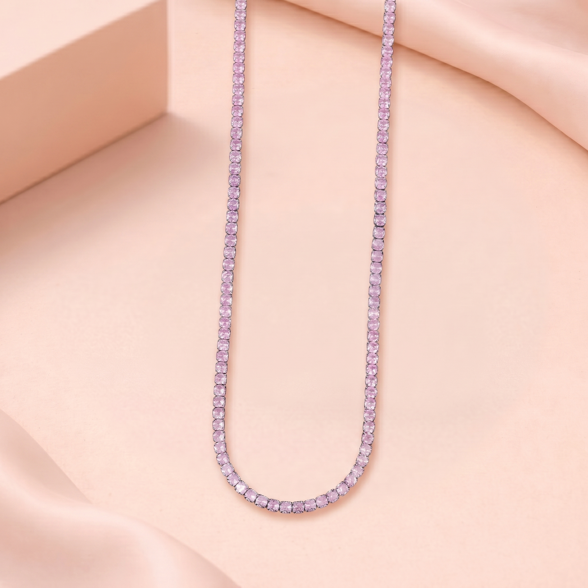 Designed with a continuous line of delicate pink crystals, each stone is beautifully set to reflect light and create a graceful, shimmering effect. The classic tennis chain design gives the necklace a timeless and sophisticated look.