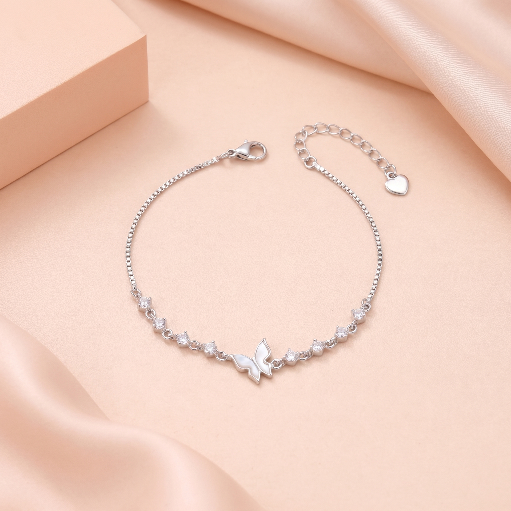 Regular price Rs. 3,599.00Regular priceUnit price / perRs. 4,749.00Sale price Rs. 3,599.00This graceful silver bracelet features a delicate chain adorned with shimmering round stones and a beautifully crafted butterfly centerpiece. The butterfly, accented with a smooth enamel-like finish, symbolizes elegance and transformation, while the sparkling stones add a refined brilliance. Designed with an adjustable extension and secure clasp, this bracelet offers both comfort and style—perfect for adding a subtle, feminine charm to everyday wear or special occasions.