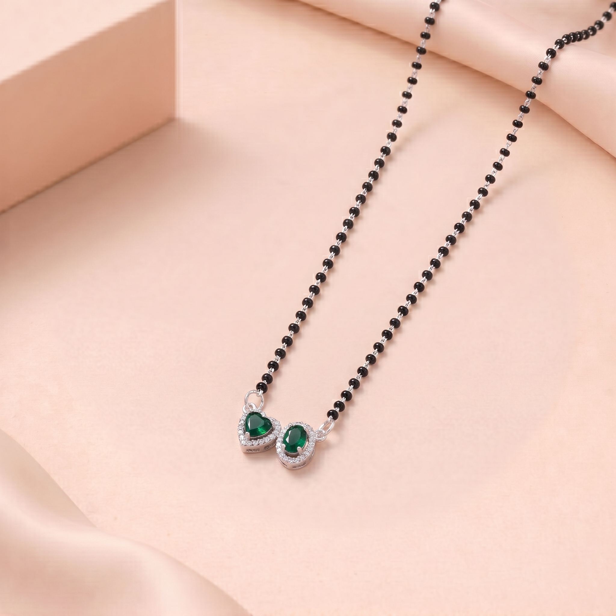 The classic black beaded chain beautifully represents tradition and marital harmony, while the silver-tone finish adds a graceful contemporary charm. The pendant features a delicate leaf-inspired design adorned with shimmering crystal accents, flowing into a captivating green teardrop crystal that adds a touch of vibrant sophistication.