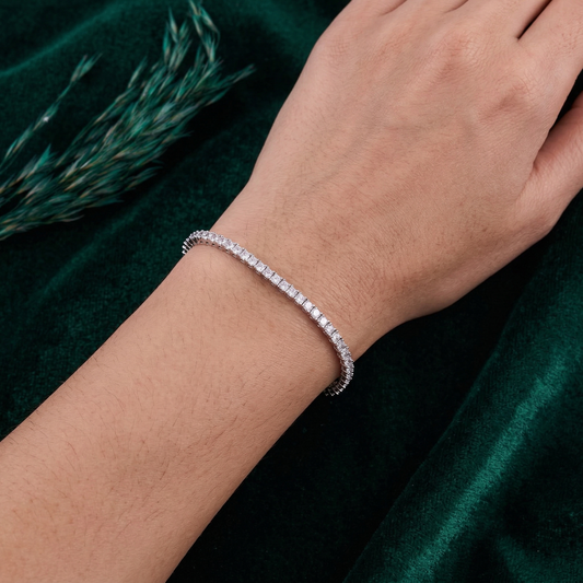 Regular price Rs. 5,449.00Regular priceUnit price / perRs. 7,059.00Sale price Rs. 5,449.00This stunning silver tennis bracelet features a continuous row of precisely set princess-cut stones, offering a sleek and modern sparkle. The clean, geometric design enhances its brilliance, making it a sophisticated statement piece. Finished with a secure clasp for a comfortable fit, this bracelet is perfect for adding refined elegance to both everyday looks and special occasions.