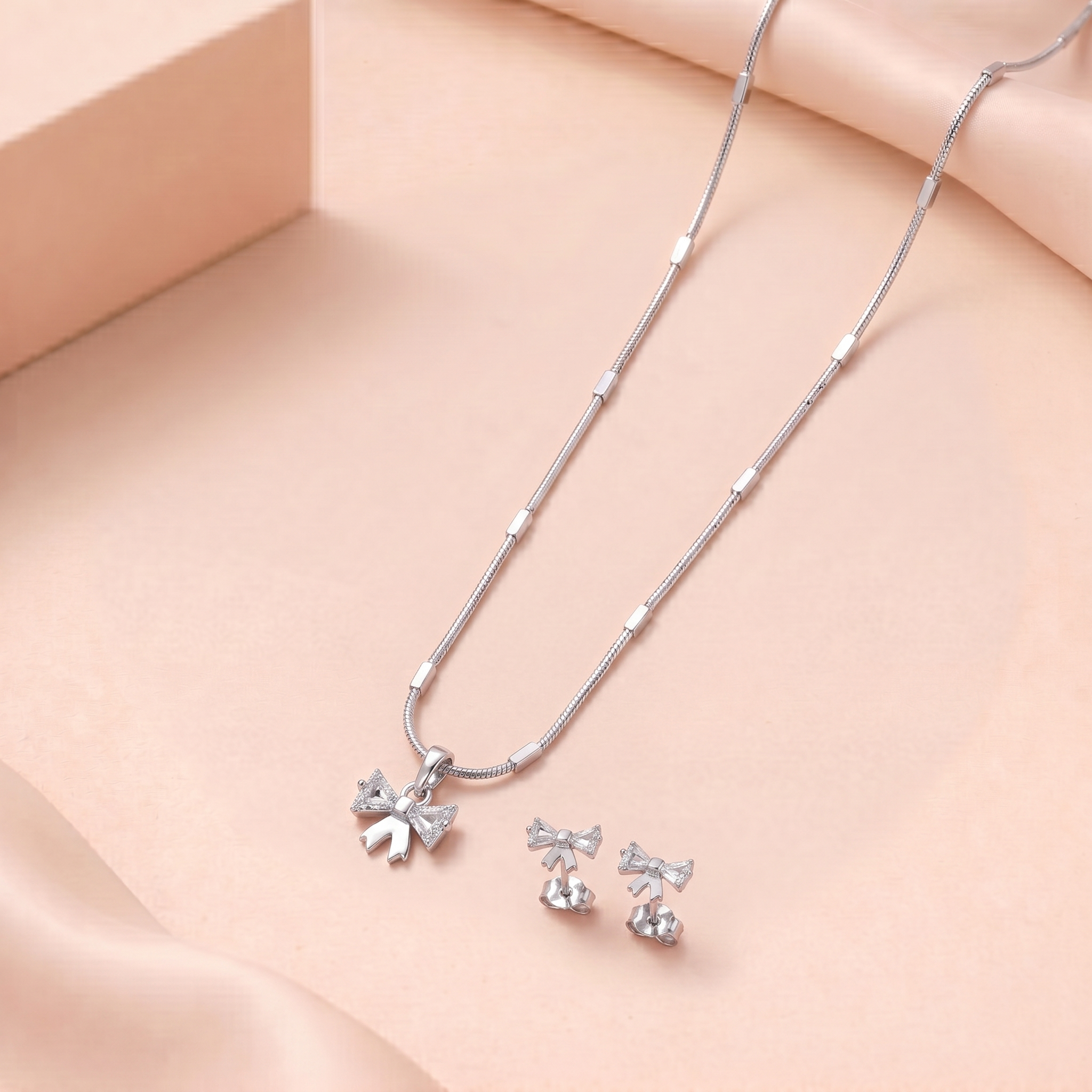 The matching bow stud earrings complete the set with coordinated brilliance, making it perfect for both everyday wear and special occasions.