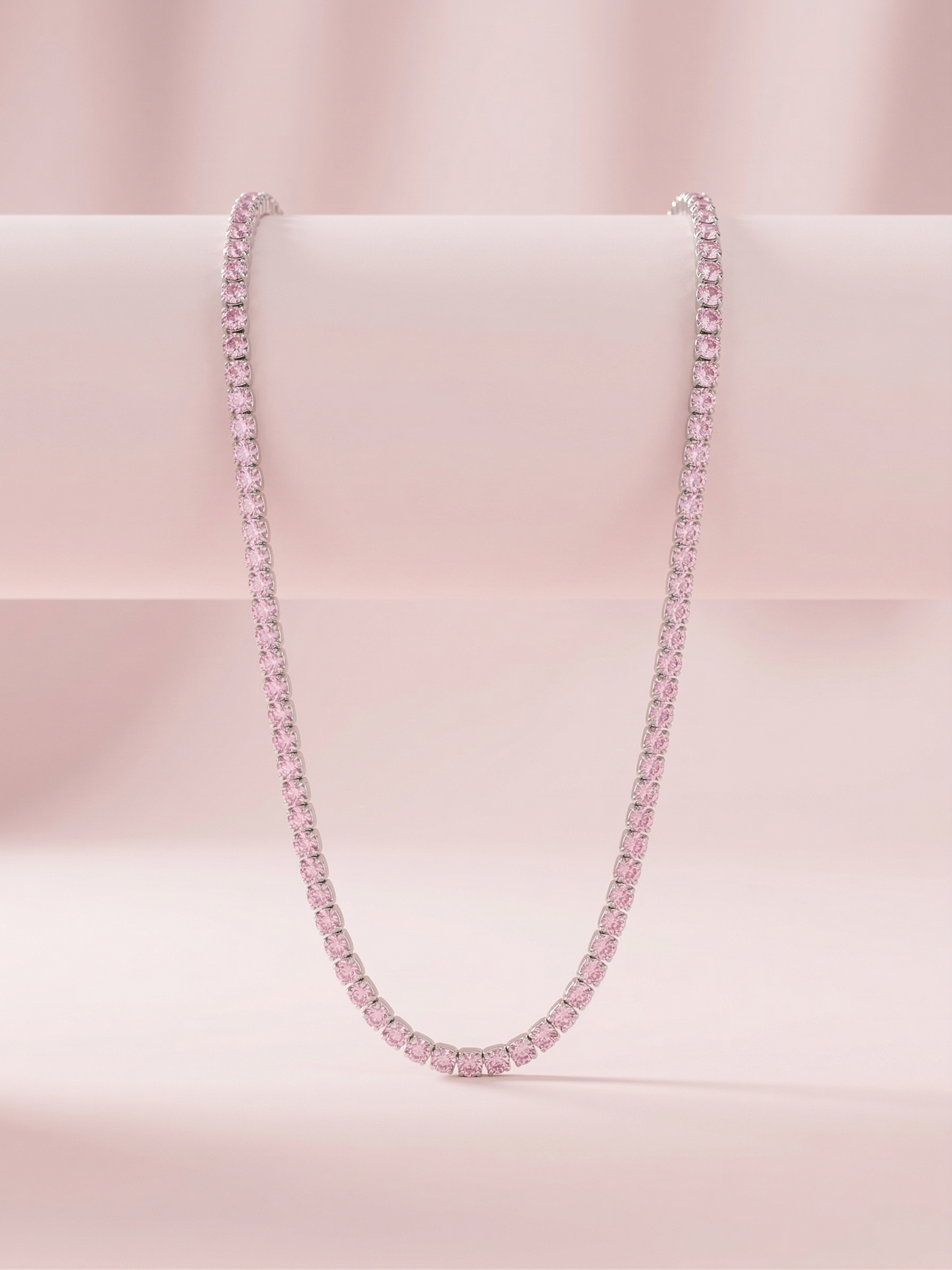 Designed with a continuous line of delicate pink crystals, each stone is beautifully set to reflect light and create a graceful, shimmering effect. The classic tennis chain design gives the necklace a timeless and sophisticated look.