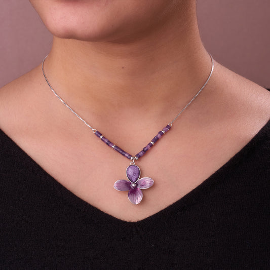 The pendant features a beautifully detailed floral motif with delicate translucent petals and a rich purple-toned centerpiece, suspended from a stylish beaded silver chain that enhances its contemporary appeal. The matching earrings mirror the same floral design, creating a perfectly coordinated and refined look.