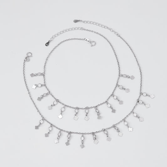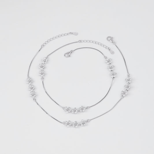 Designed with delicate layered chains, this elegant anklet features a captivating combination of sleek clover motifs and sparkling floral charms encrusted with brilliant cubic zirconia stones. The alternating elements create a refined balance of shine and sophistication, gently catching the light with every step.