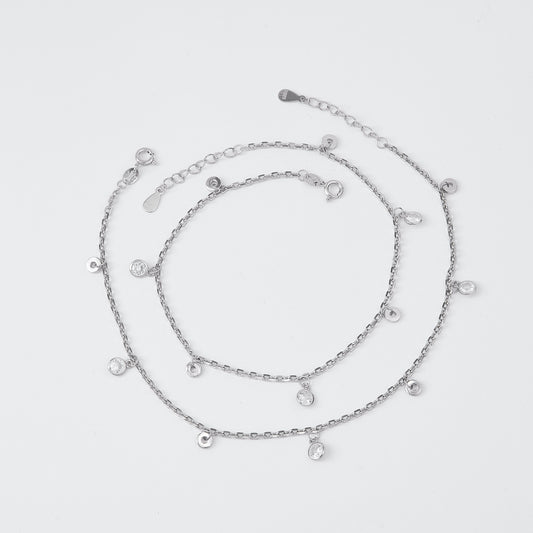 Designed with a fine, elegant chain, this anklet features evenly spaced cubic zirconia stones paired with petite teardrop-shaped charms that gently dangle with every movement. The delicate drops create a soft shimmer effect, adding a playful yet sophisticated touch to your look.