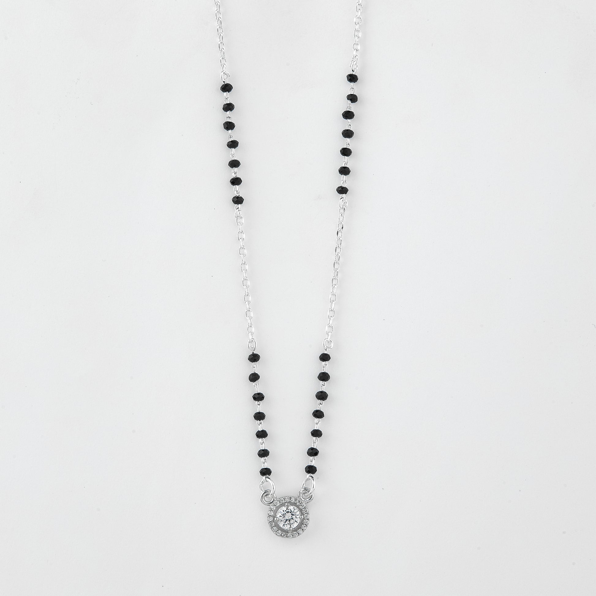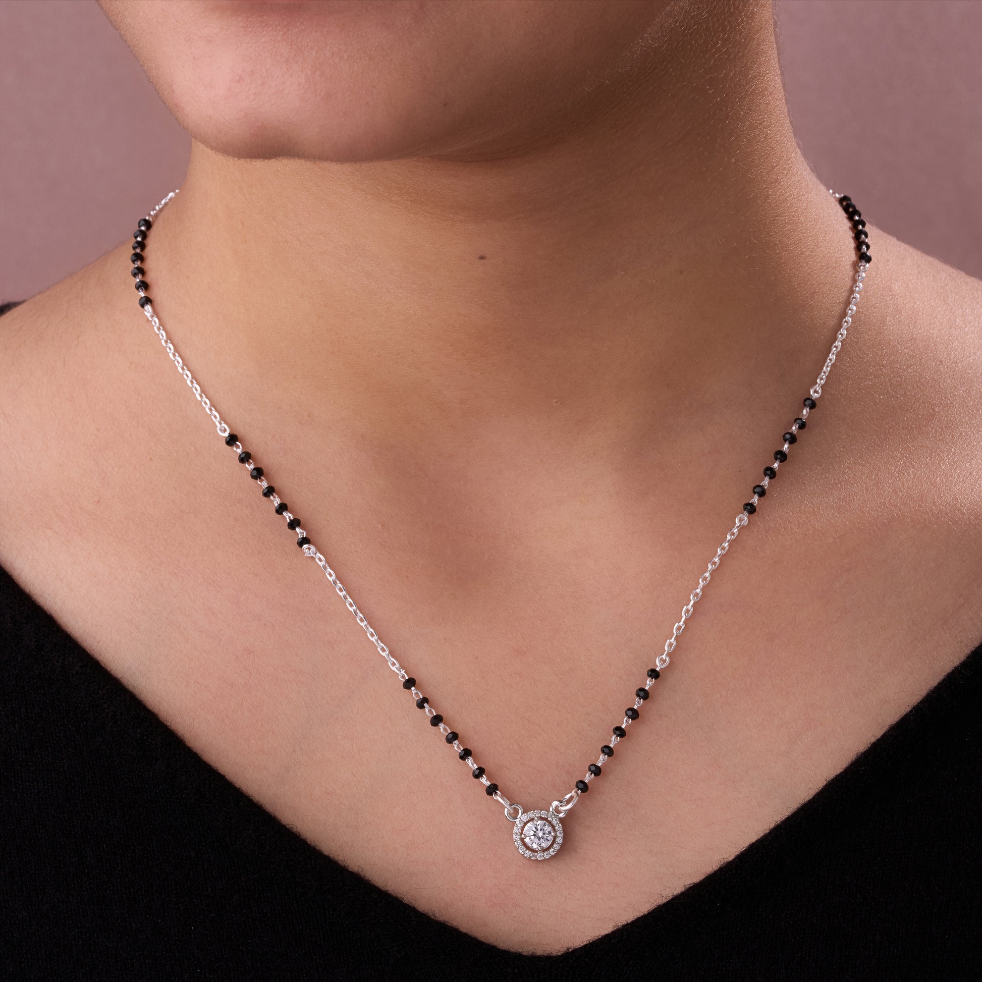 Designed with traditional black beads that symbolize everlasting love and protection, this graceful piece is paired with a sleek silver-toned chain for a refined finish. The centerpiece features a timeless round pendant, adorned with a sparkling solitaire at its heart and encircled by delicate shimmering accents for added brilliance.