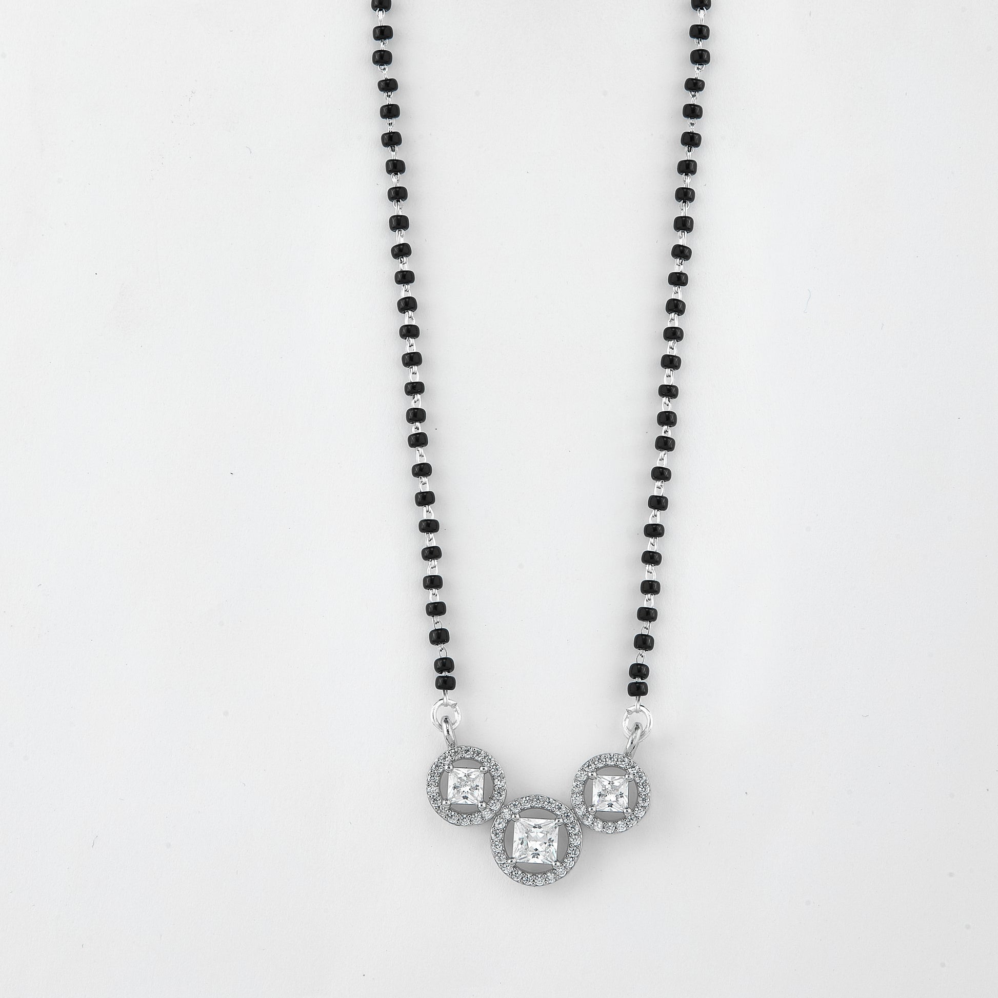 Featuring traditional black beads that symbolize love and commitment, this beautifully crafted mangalsutra is designed with a sleek silver-tone chain for a refined, modern touch. The centerpiece showcases three sparkling square-cut stones, each framed with a delicate halo of shimmering accents, creating a balanced and eye-catching triple pendant design.