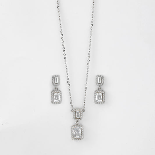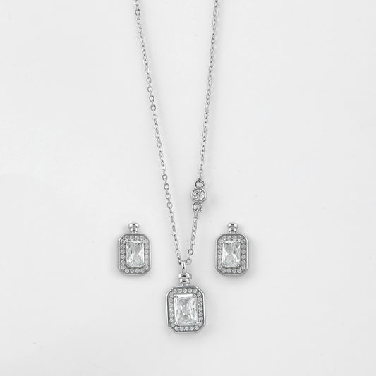Suspended from a sleek silver chain, the pendant exudes modern sophistication, while the matching stud earrings complete the set with perfectly coordinated sparkle. Ideal for special occasions, evening wear, or graceful everyday styling, this exquisite set adds a touch of luxury and charm to every look.