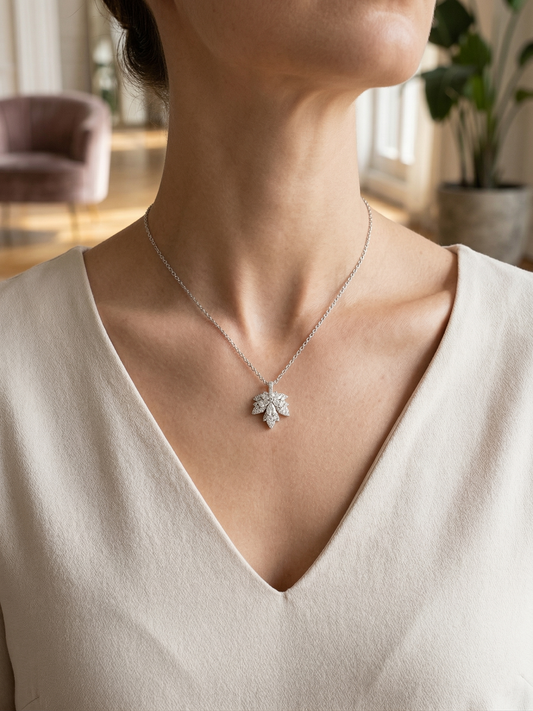 Crafted in a sleek silver-tone finish, the pendant features a delicate leaf-inspired bloom design, beautifully adorned with shimmering crystals that catch the light from every angle. The fine, minimal chain enhances its elegance, allowing the intricate floral motif to stand out effortlessly.