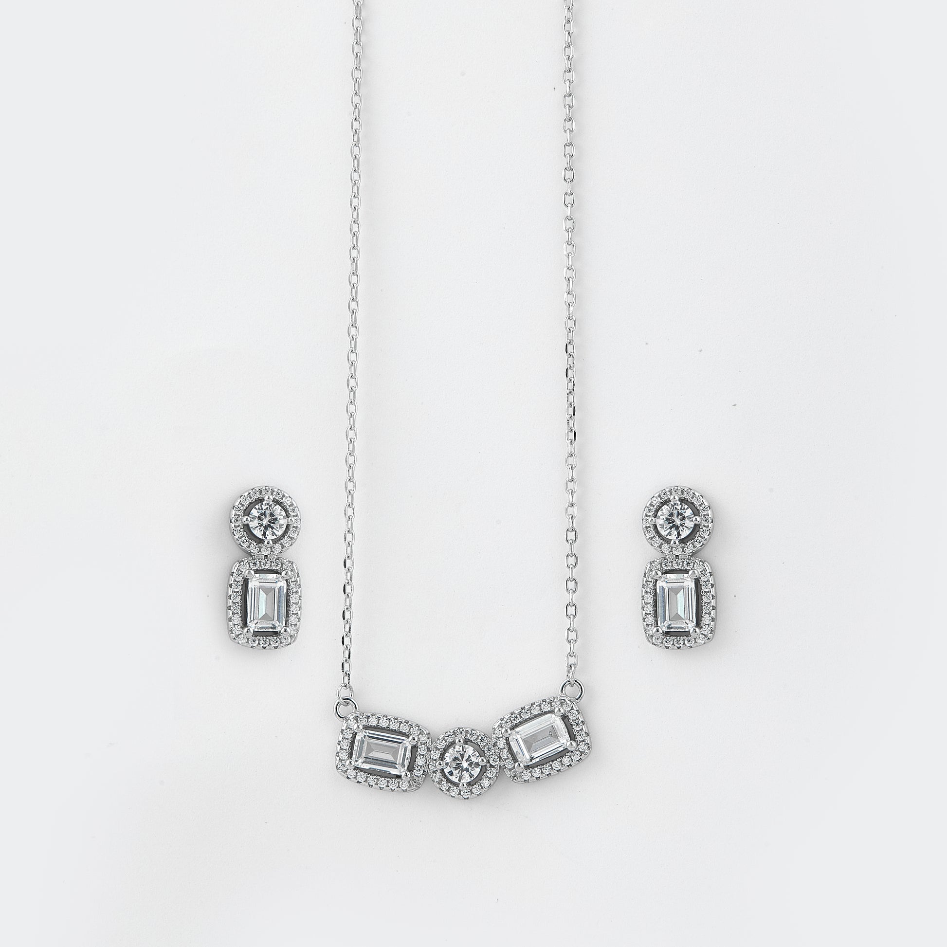• Refined sparkle meets modern elegance in this Elegant Baguette & Round Halo Pendant Necklace Set, crafted in pure 92.5 sterling silver.