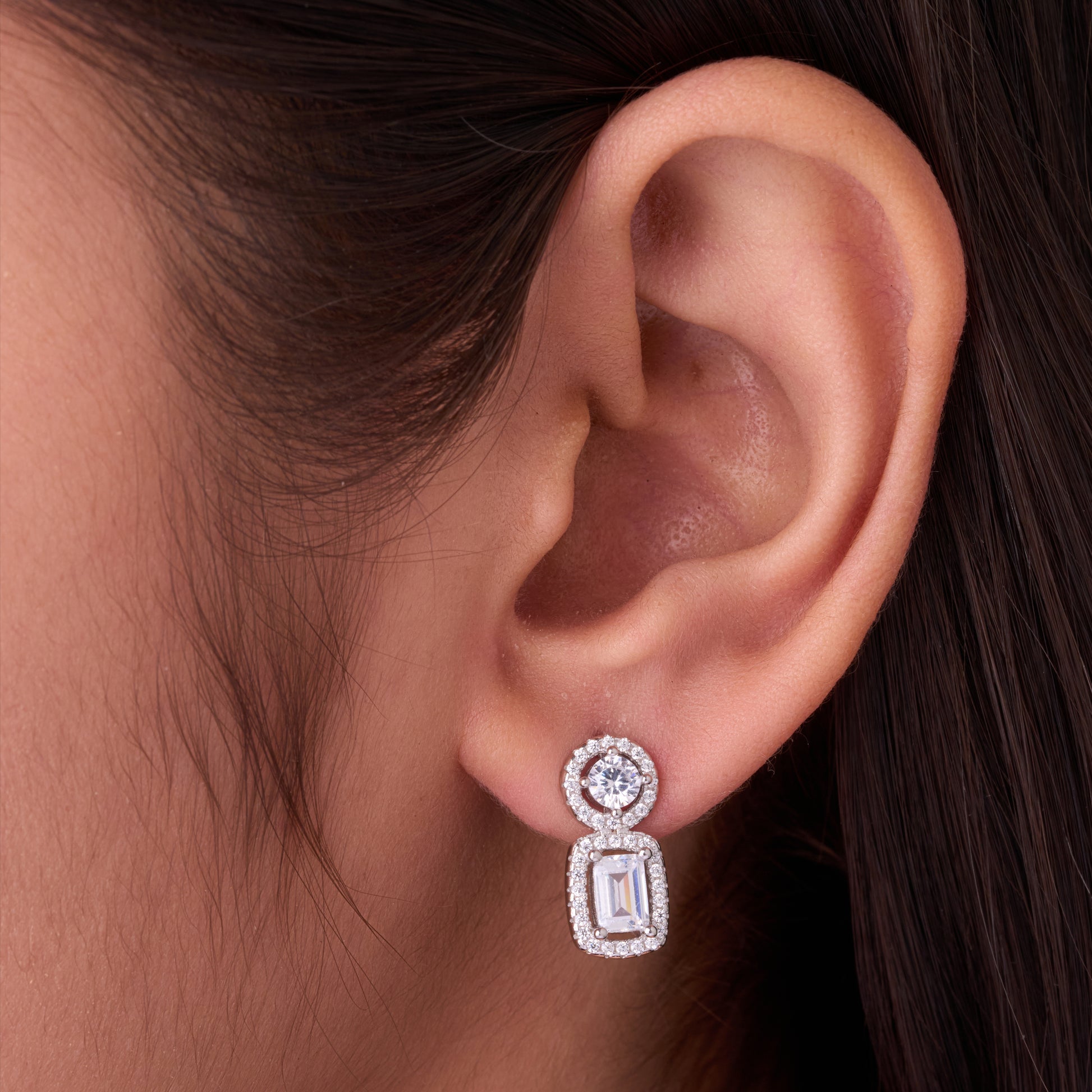 The matching drop earrings mirror the same baguette and round halo pattern, offering a coordinated style with just the right amount of brilliance.