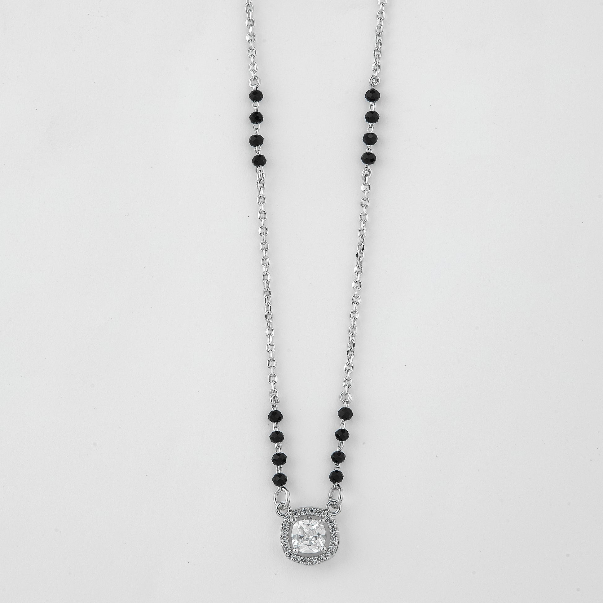 Adorned with classic black beads symbolizing love and commitment, this beautifully crafted piece features a delicate silver-toned chain that enhances its refined charm. The highlight is a stunning cushion-cut centerpiece, surrounded by a shimmering halo of accent stones that amplify its brilliance and sophistication.