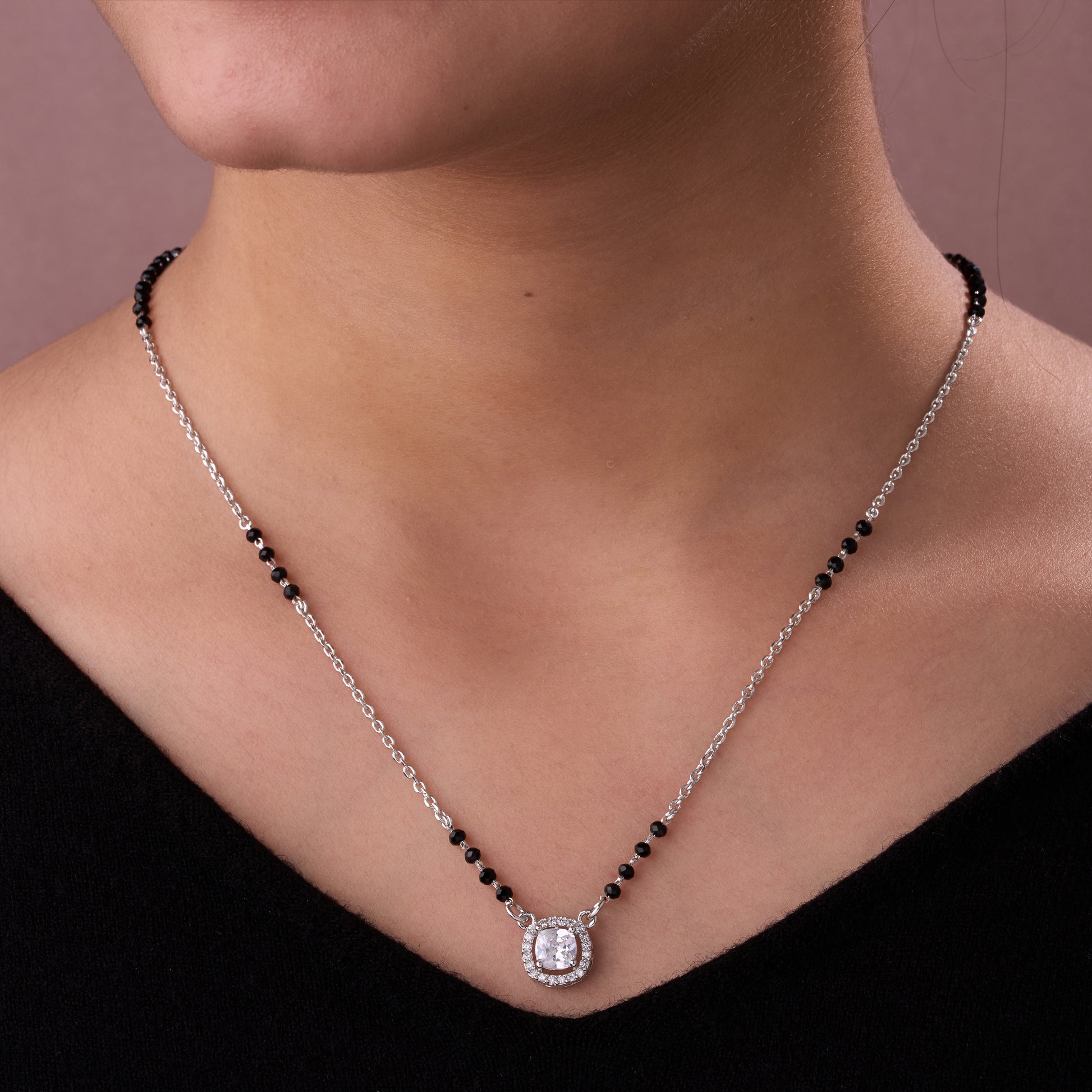 Celebrate timeless elegance with this Graceful Silver-Tone Mangalsutra with Black Beads and Sparkling Cushion-Cut Pendant.