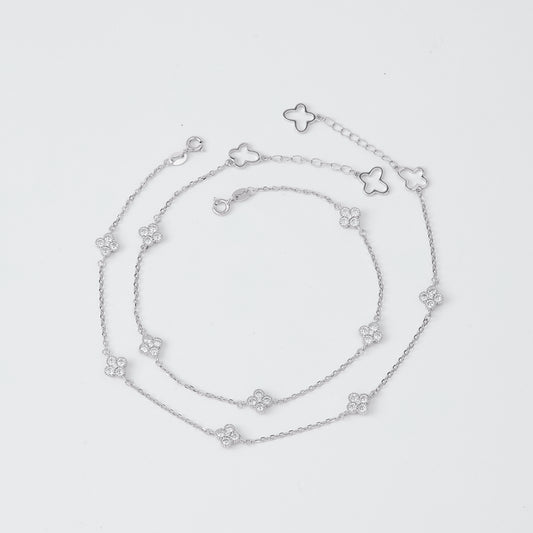 Designed with delicate layered chains, this elegant anklet features a captivating combination of sleek clover motifs and sparkling floral charms encrusted with brilliant cubic zirconia stones. The alternating elements create a refined balance of shine and sophistication, gently catching the light with every step.