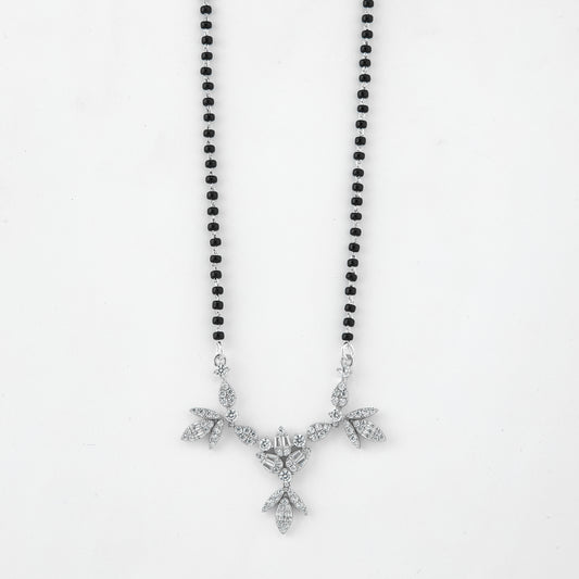Beautifully crafted with traditional black beads symbolizing love and commitment, this mangalsutra is elevated with a stunning floral-inspired crystal pendant. Delicately arranged marquise and round-cut stones form a sparkling leaf and blossom pattern, creating a radiant centerpiece that exudes elegance and charm.