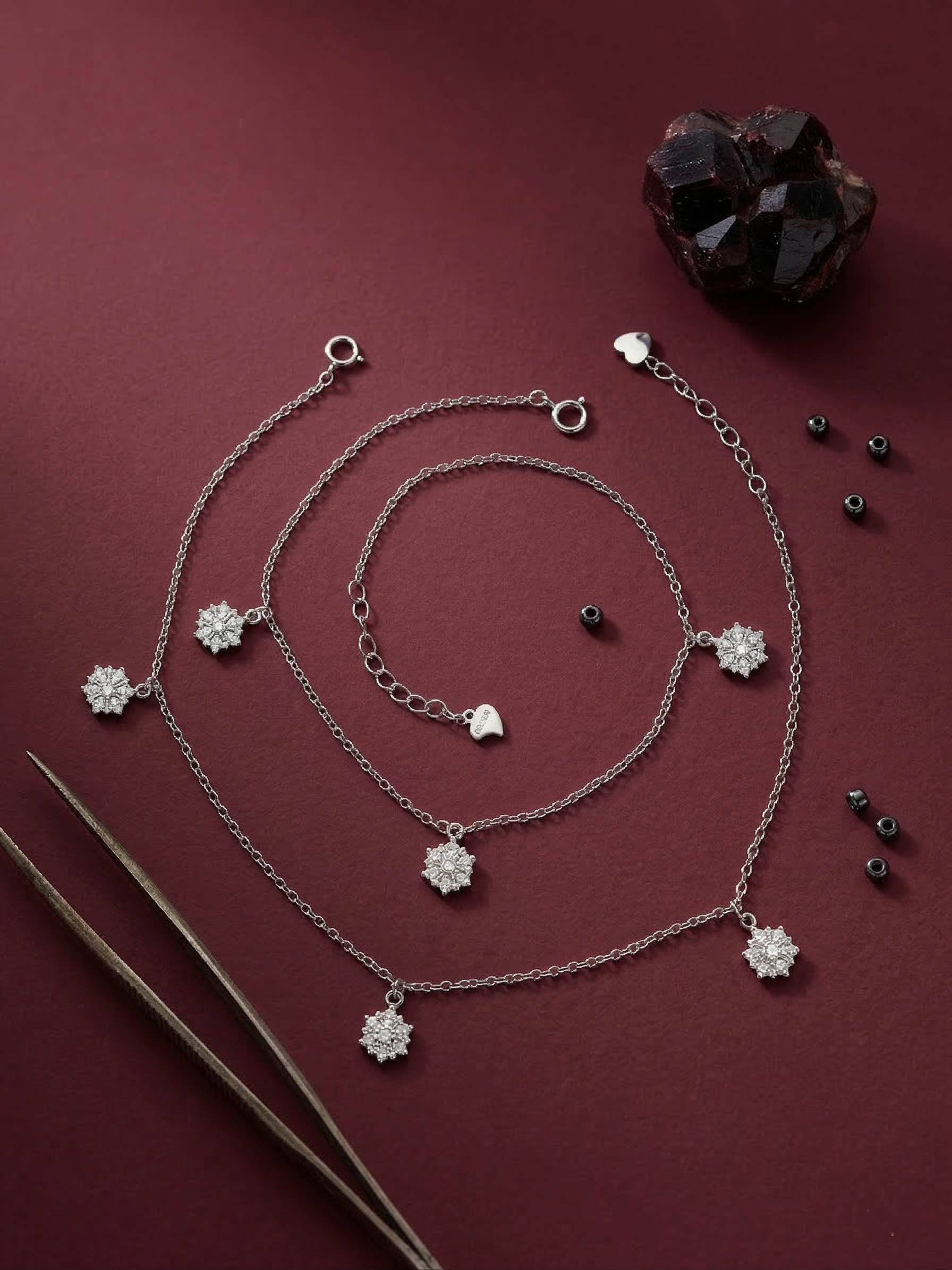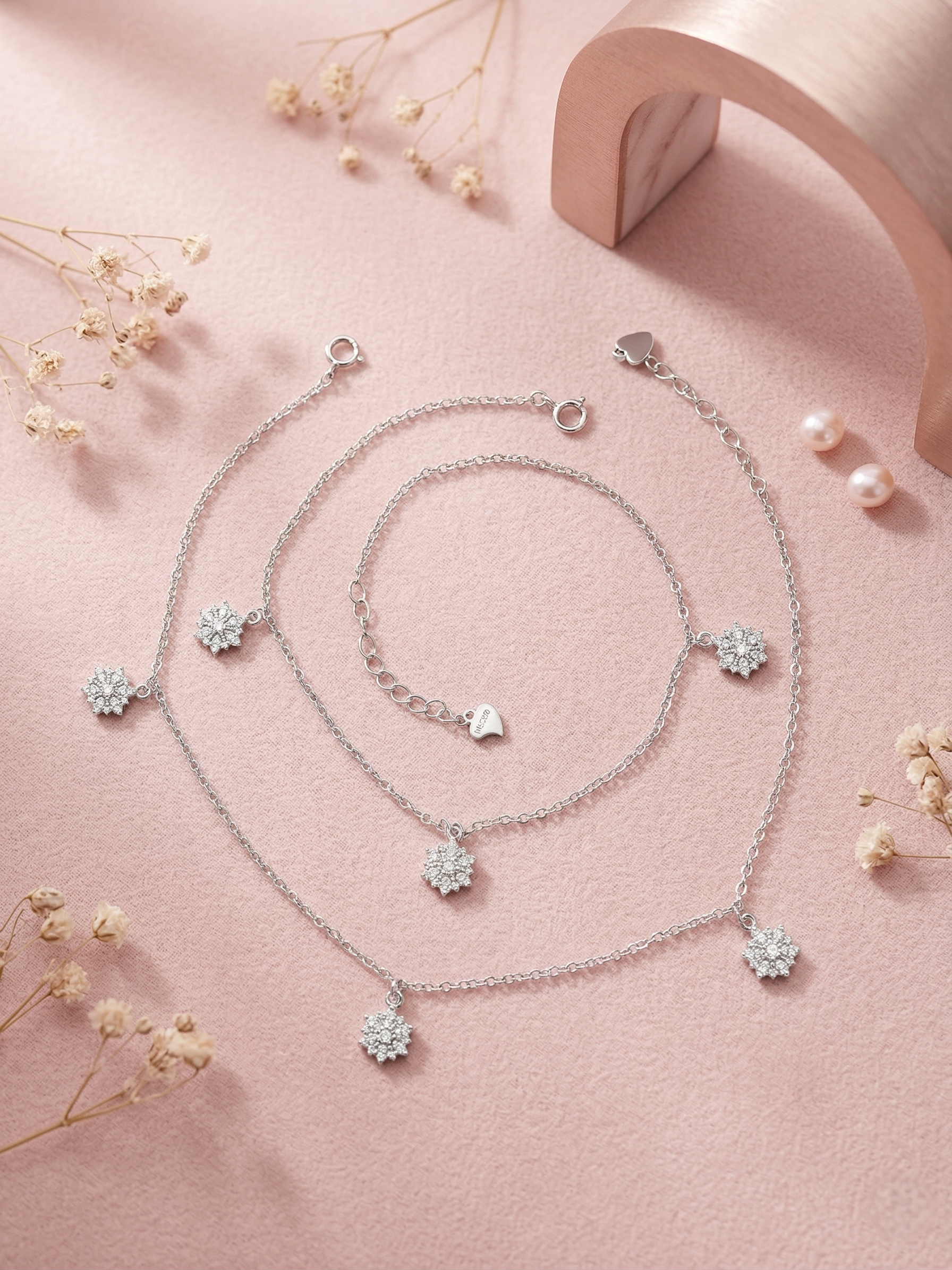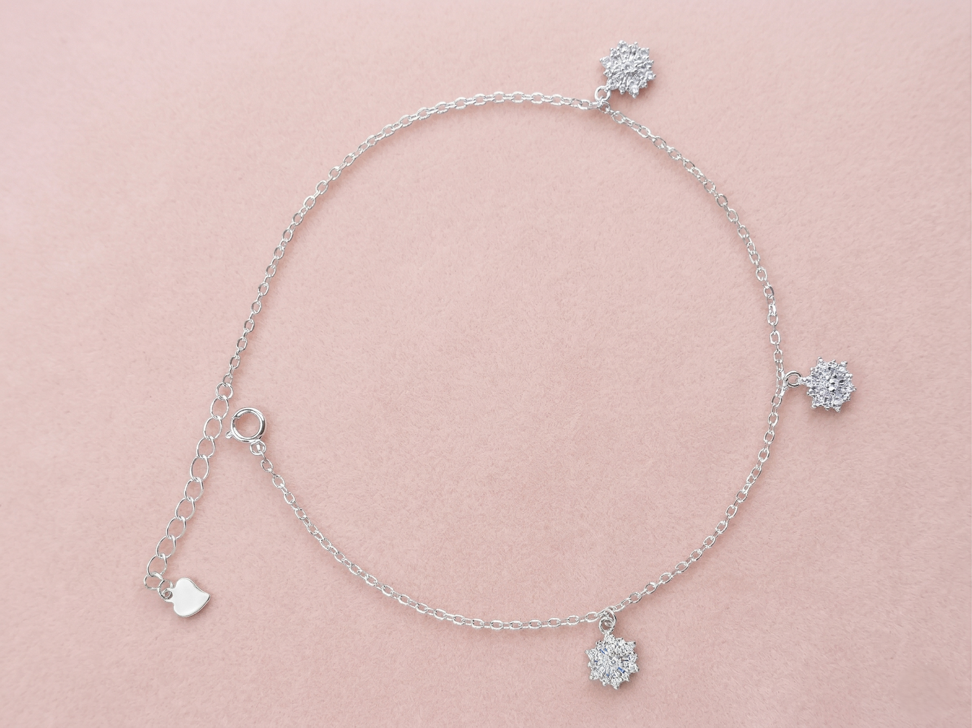 Add a graceful sparkle to your look with this Sparkling Charm Drop Dangle Anklet in 92.5 Sterling Silver. Beautifully crafted from high-quality sterling silver, this delicate anklet features multiple shimmering snowflake charms that gently dangle along a fine chain. Each snowflake is adorned with sparkling stones, creating a radiant shine that catches the light with every step.